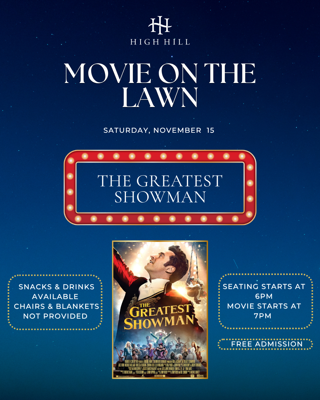 Bring a chair, blanket, and the family to High Hill on November 15, for Movie on the Lawn! Our feature film is The Greatest Showman! Seating starts at 6:00 pm and the movie begins at 7:00 pm. Snacks and Drinks will be available for purchase. Chairs and Blankets won’t be provided, and admission is free!